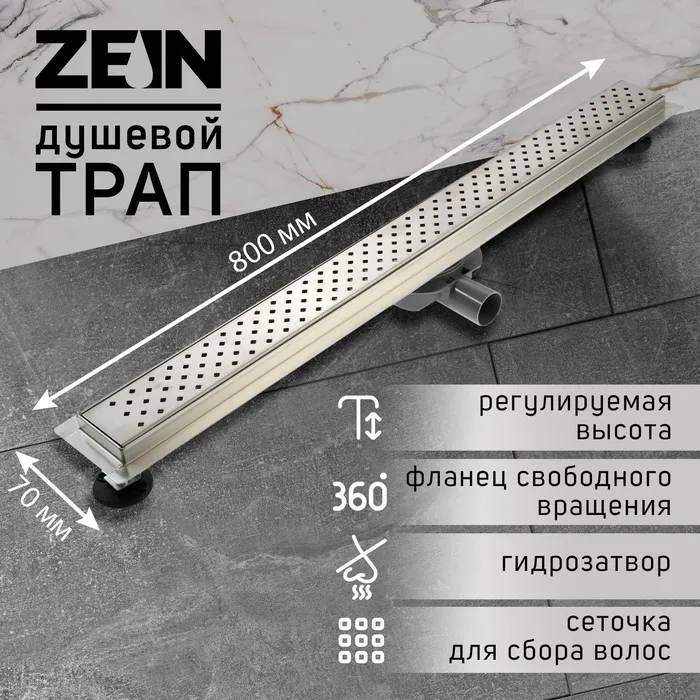 Трап ZEIN, c фланцем свободного вращения 360°, 7×80 см, d=40/50 мм, нерж. сталь, сатин