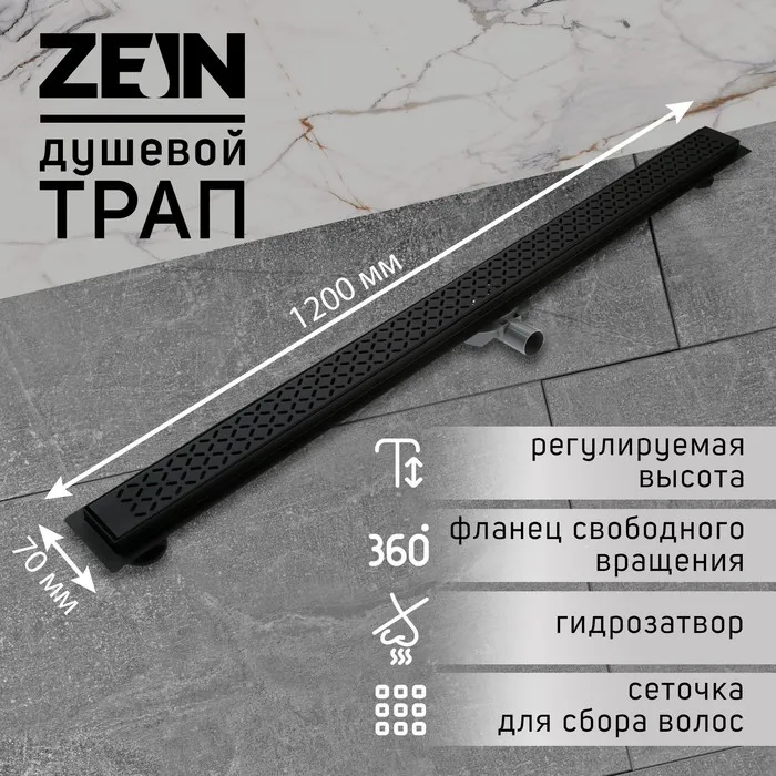 Трап ZEIN, c фланцем свободного вращения 360°, 7×120 см, d=40/50 мм, нерж. сталь, черный