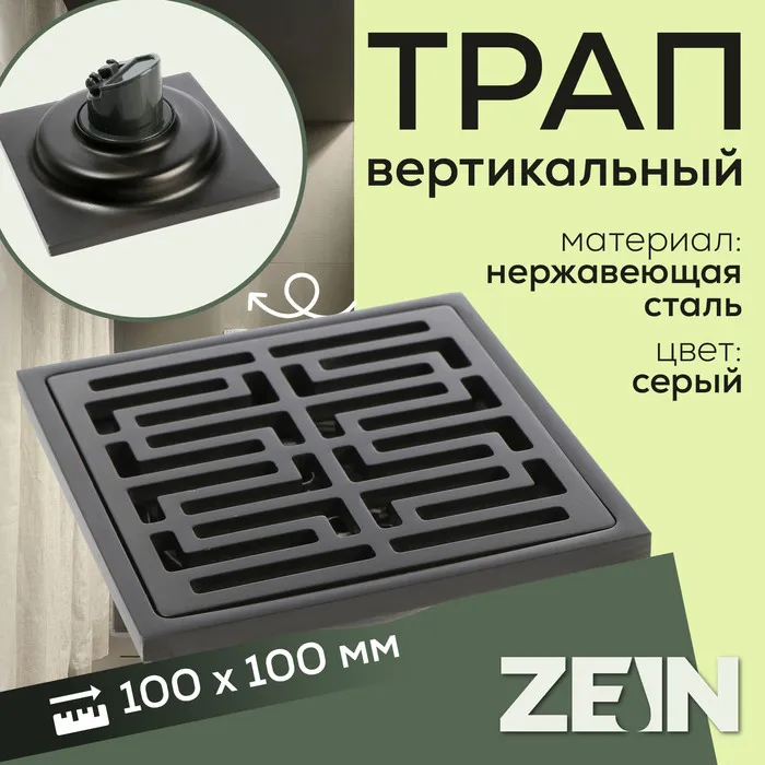Трап ZEIN, 100×100 мм, вертикальный, d=32 мм, нержавеющая сталь, серый