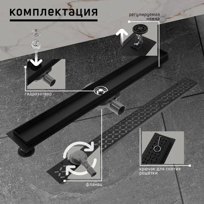 Трап ZEIN engr, c флaнцeм свободного вращ 360°, 7×80 см, d=40/50 мм, нерж сталь, черный — Характеристики