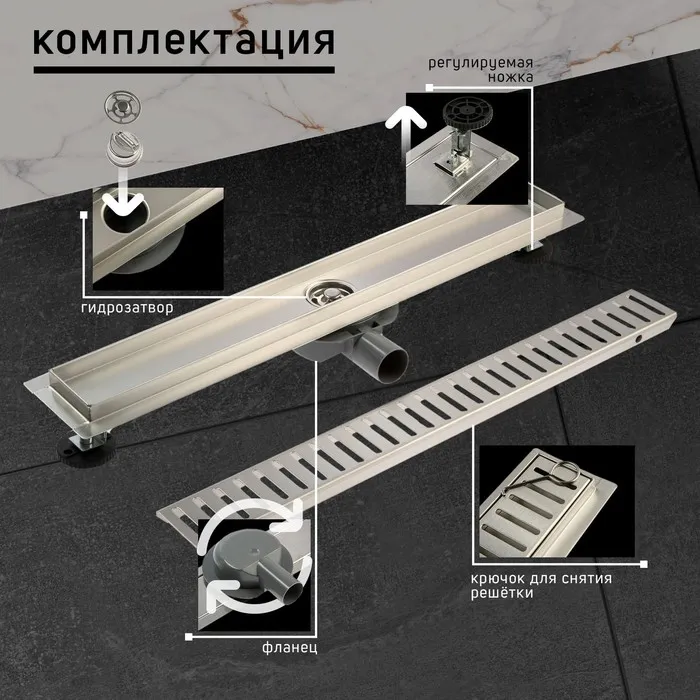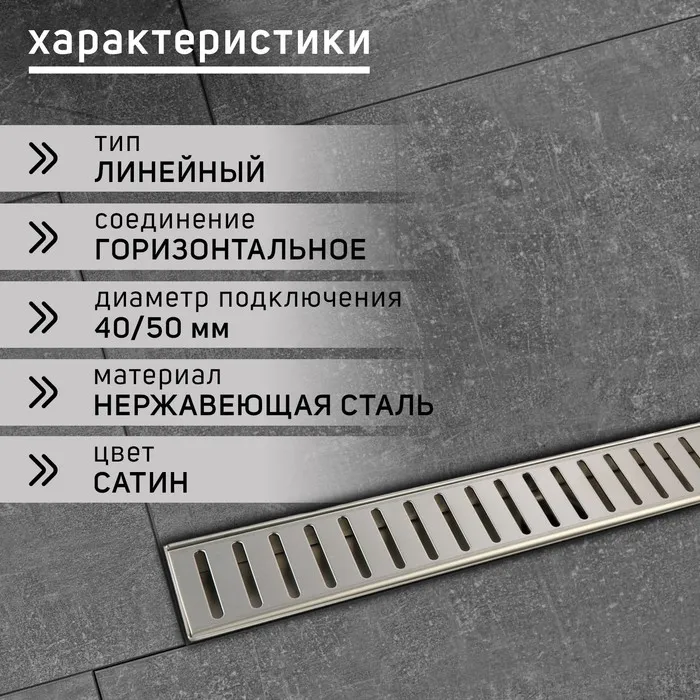 Трап ZEIN engr, с фланцем свободного вращ 360°, 7×60 см, d=40/50 мм, нерж сталь, сатин — Характеристики
