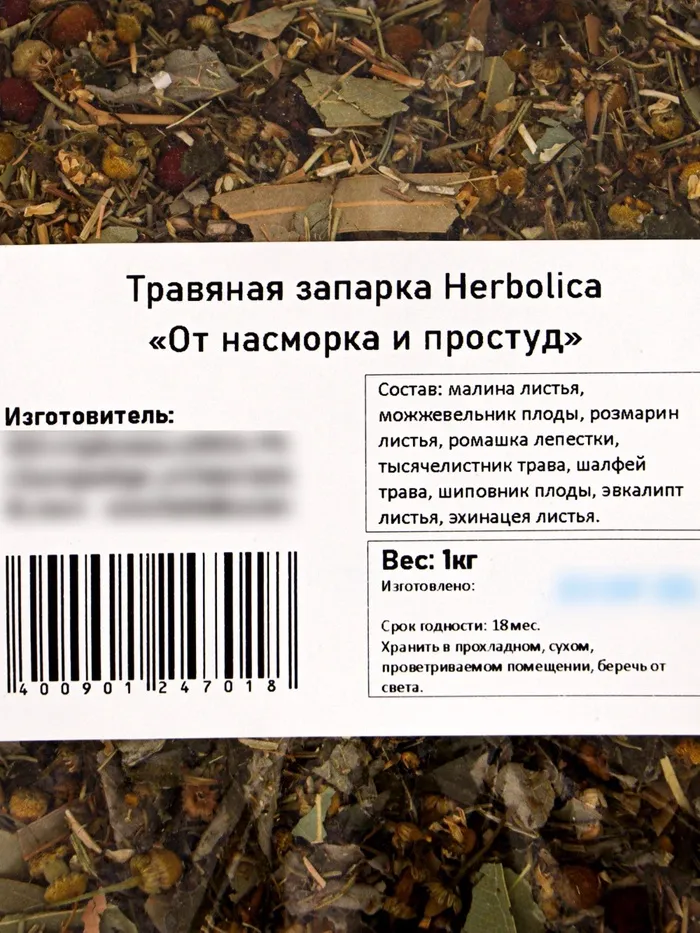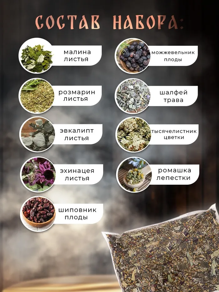 Состав: малина листья, можжевельник плоды, розмарин листья, ромашка лепестки, тысячелистник трава, шалфей трава. шиповник плоды, эвкалипт листья, эхинацея листья.