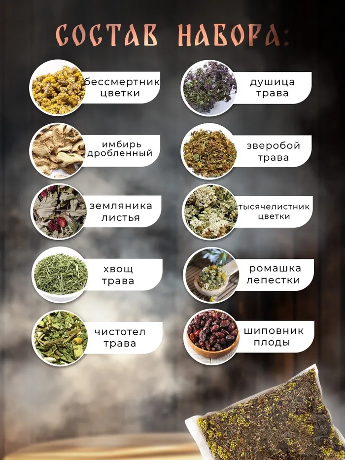 Состав: бессмертник цветки, душица трава, зверобой трава, земляника листья, имбирь дробленый, ромашка лепестки, тысячелистник цветки, хвощ трава, чистотел трава, шиповник плоды.