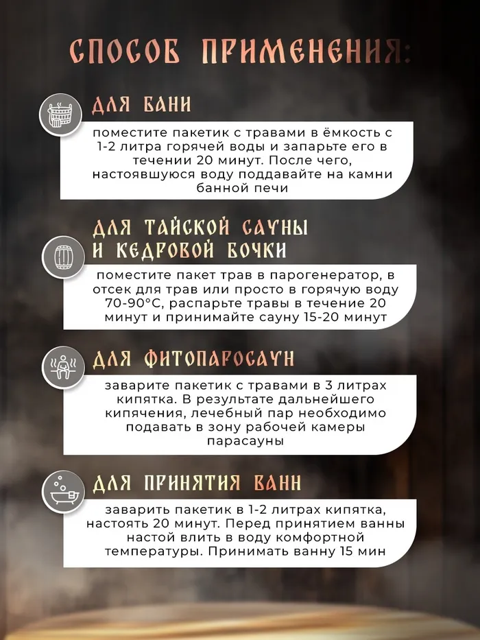 1. Для бани: поместите пакетик с травами в ёмкость с 1-2 литра горячей воды и запарьте его в течении 20 минут. После чего, настоявшуюся воду поддавайте на камни банной печи.
