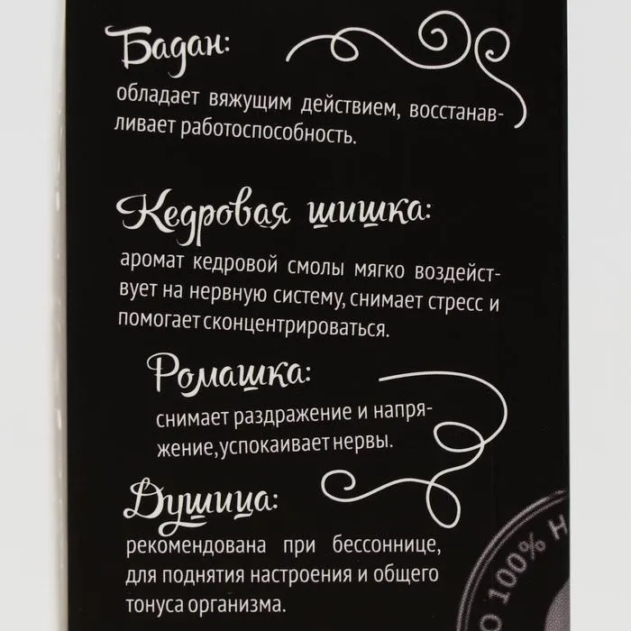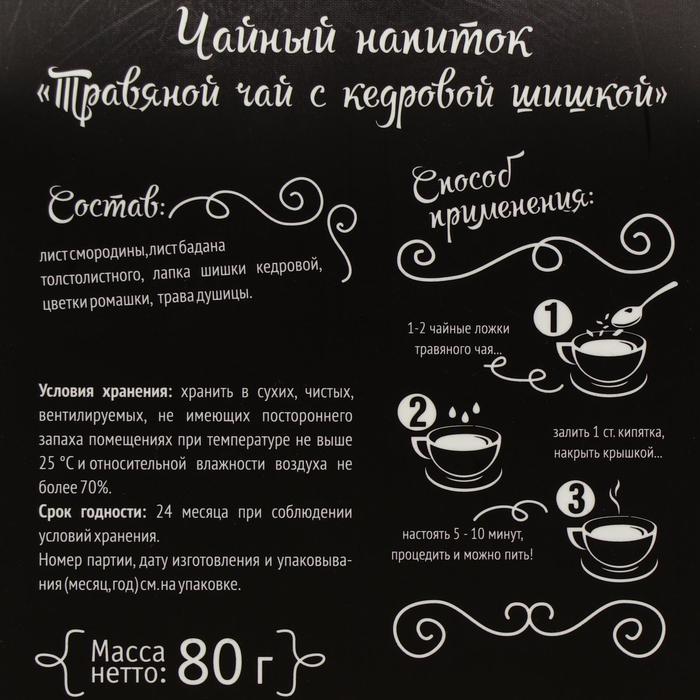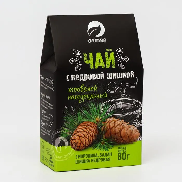Состав: лист смородины, лист бадана толстолистного, лапка шишки кедровой, цветки ромашки, трава душицы.