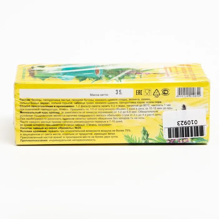 Состав: береза, листья папоротника; гвоздики бутоны, конского щавеля плоды, зюзника, люцерны, папоротника, первоцвета, пижмы, полыни Божье дерево, полыни горькой, чабреца трава, конского щавеля, папоротника корни, осины кора.