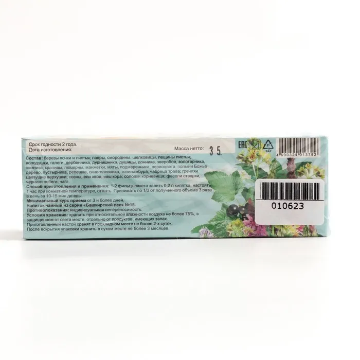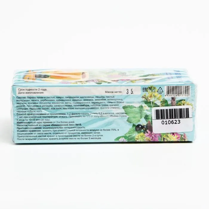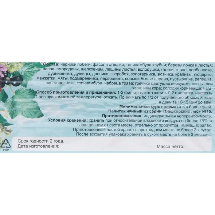 Состав: почки березы, березы, лавра, смородины, шелковицы листья, володушки, галеги, дербенника, дурнишника, душицы, донника, зверобоя, золотарника, зюзника, крапивы, люцерны, манжетки, мяты, первоцвета, подмаренника, полыни Божье дерево, пустырника, репешка, синеголовника, топинамбура, цикория, чабреца трава; гречихи цветущие верхушки, ели, сосны хвоя, ивы кора, солодки корневища, фасоли створки, чага, черники побеги.