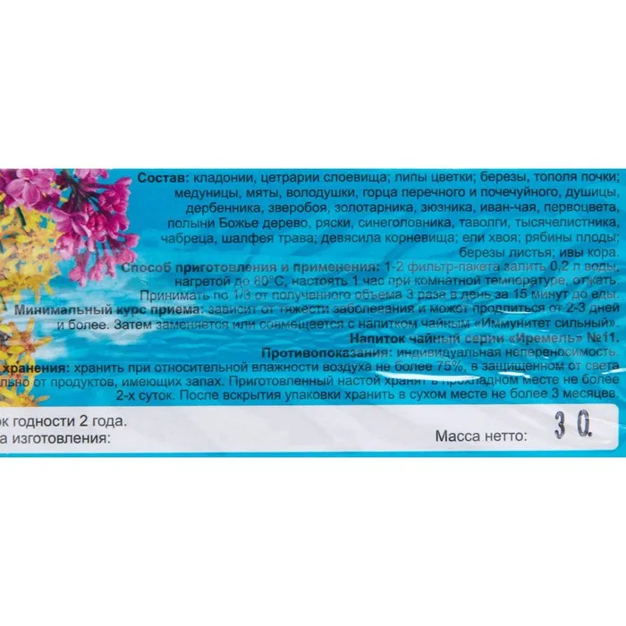 Минимальный курс приема: зависит от тяжести заболевания и может продлиться от 2-3 дней и более. Затем заменяется или совмещается с напитком чайным «Иммунитет сильный».