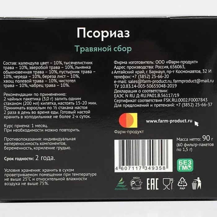 Срок годности сбора травяного при псориазе при соблюдении условий хранения 2 года с даты производства.