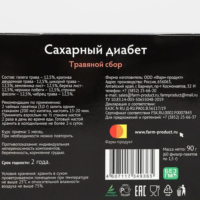 Состав: галега трава – 12,5%, крапива двудомная трава - 12,5%, цикорий трава – 12,5%, земляника лист– 12,5%, береза лист– 12,5%, черники побеги – 12,5%, стручки фасоли – 12,5%, чабрец трава – 12,5.
