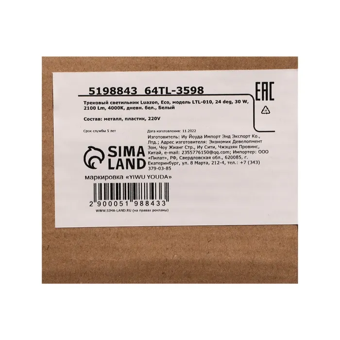 Трековый светильник Luazon lighting, LTL-010, 24 deg, 30 Вт, 2100 Лм, 4000 K, белый, свечение нейтральное белое — Характеристики