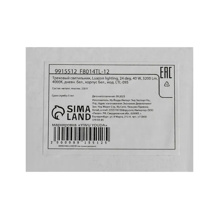 Трековый светильник Luazon lighting, LTL-095, 40 Вт, 3200 Лм, 4000 K, белый, свечение нейтральное белое — Характеристики