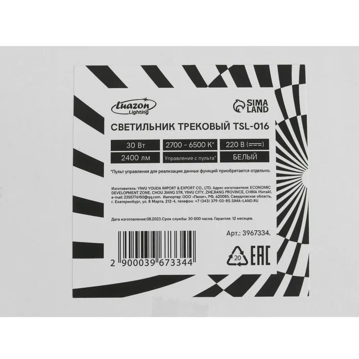 Трековый светильник Luazon Lighting TSL-016, 30 Вт, 2400 Лм, 2700-6500К, управление с пульта, белый, 3 режима свечения — Характеристики