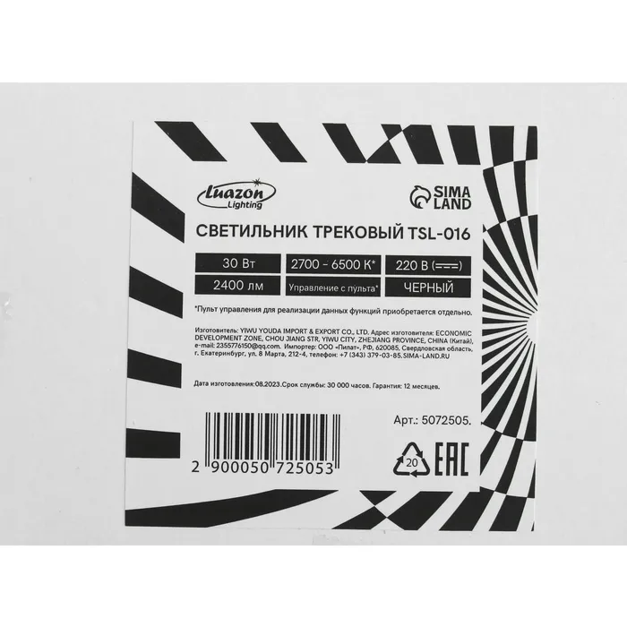 Трековый светильник Luazon TSL-016, 30 Вт, 2400 Лм, 2700-6500К, управление с пульта, чёрный, 3 режима свечения — Характеристики