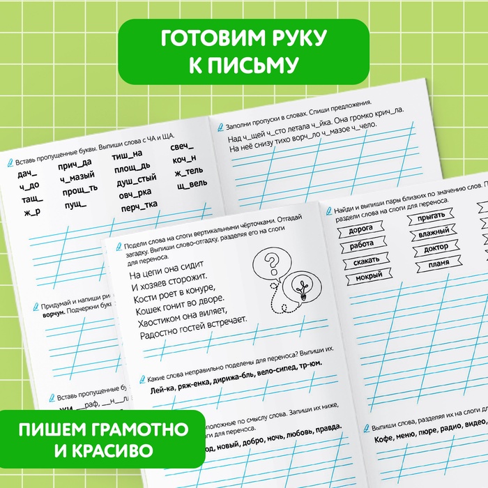 - Задания, которые помогают освоить буквы, ударения, слоги и правила русского языка.