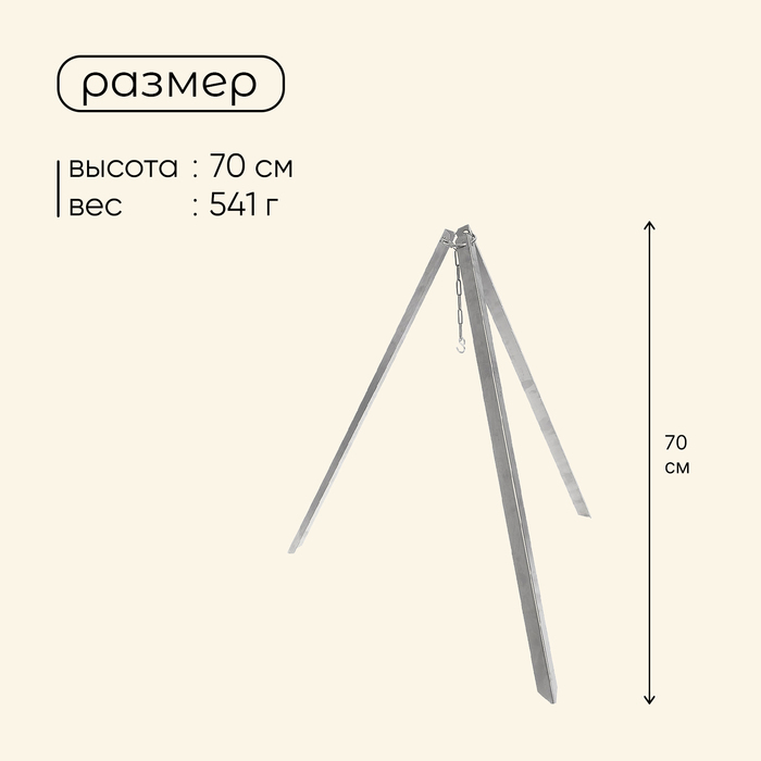 Сварить суп из свежевыловленной рыбки? А может, нагреть воду для посиделок с чаем у костра? С треногой для вас откроется масса возможностей по приготовлению пищи в походных условиях. Установите изделие, повесьте чан на крюк и наслаждайтесь блюдами, приготовленными на свежем воздухе.