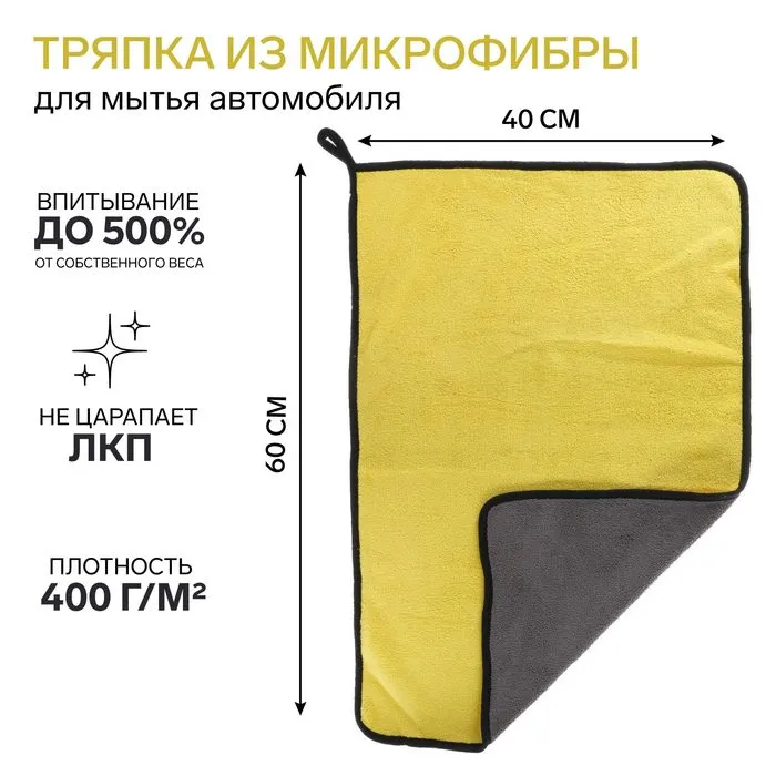 Тряпка для мытья авто, CARTAGE, микрофибра, 400 г/м², 40×60 cм, желто-серая — Характеристики