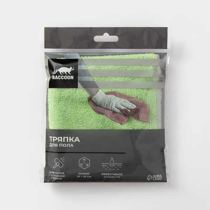 Тряпка для пола Raccoon, 250 г/м², 50×30 см, микрофибра, с оверлоком, 1 шт, зеленая