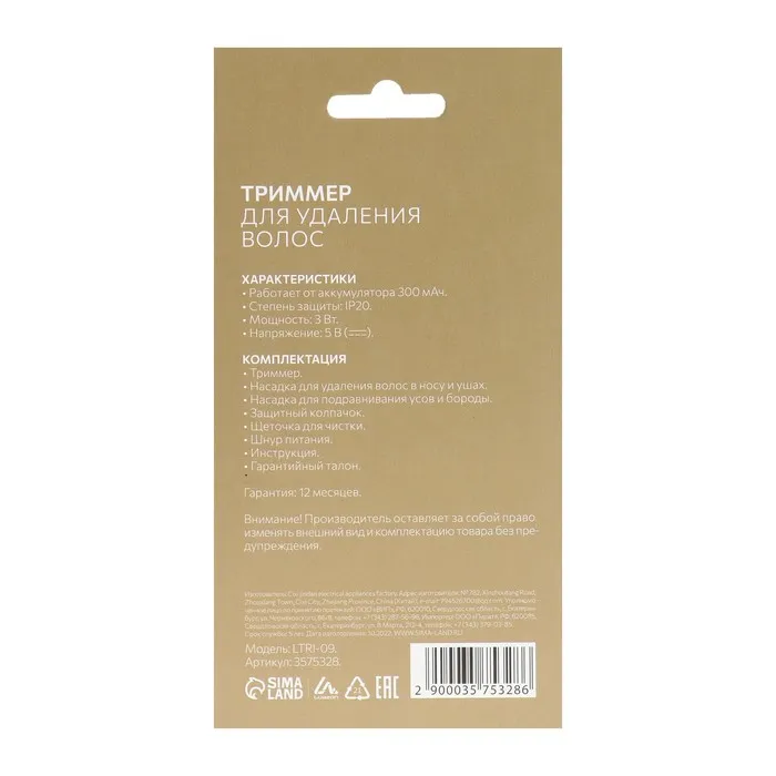 Триммер для волос Luazon LTRI-09, для носа/ушей, 2 насадки, АКБ, серый — Характеристики