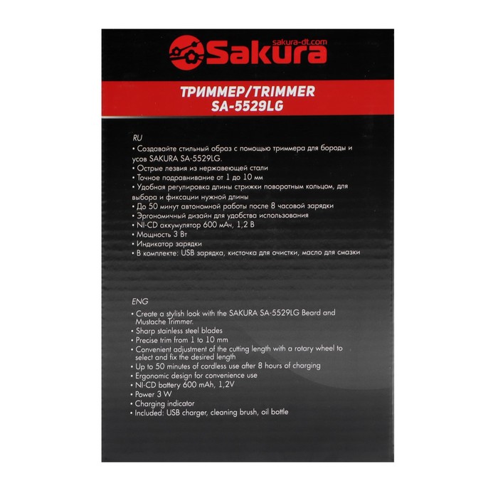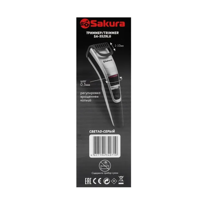 Триммер для волос Sakura SA-5529LG, для бороды/усов, 0.5-10 мм, АКБ, серебристо-чёрный — Характеристики
