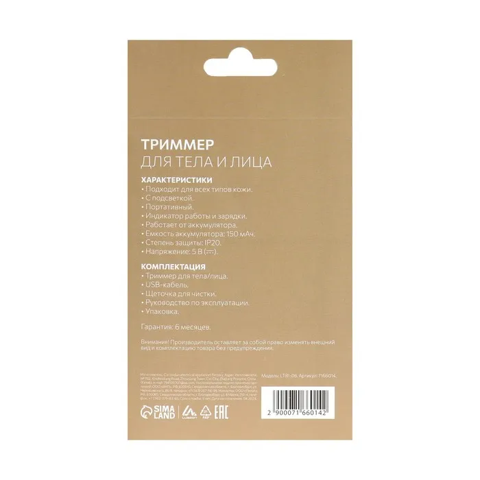 Триммер Luazon LTRI-06, для тела/лица, от USB, белый — Характеристики