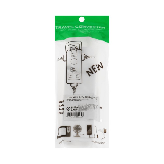 Тройник плоский, поворотный, 4 розетки, 10А, без з/к, белый — Характеристики