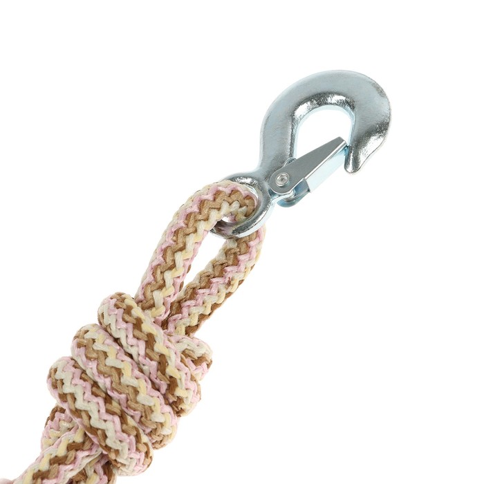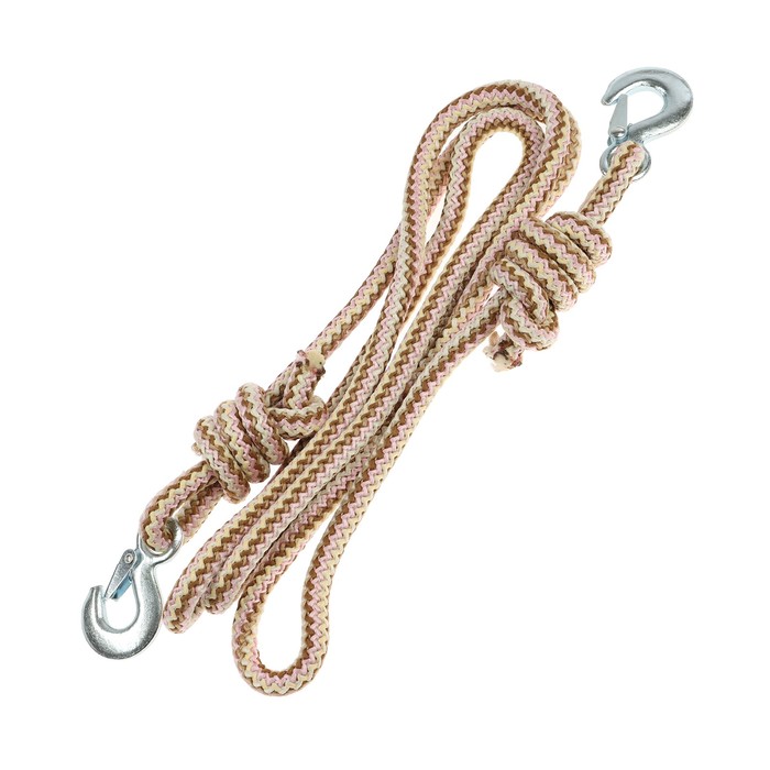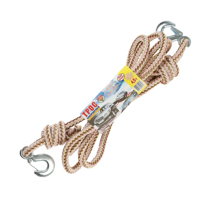 Трос буксировочный веревочный с нагрузкой 4.5 т и длиной 4.5 м. Оснащен двумя крюками для надежного крепления к автомобилю. Выполнен из высокопрочного материала, устойчивого к истиранию и механическим повреждениям. Идеально подходит для буксировки автомобилей и других транспортных средств в условиях бездорожья или при низких температурах.