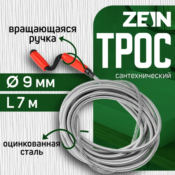 Трос сантехнический ZEIN engr, оцинкованный, с вращающейся ручкой, d=9 мм, L=5 м — Характеристики