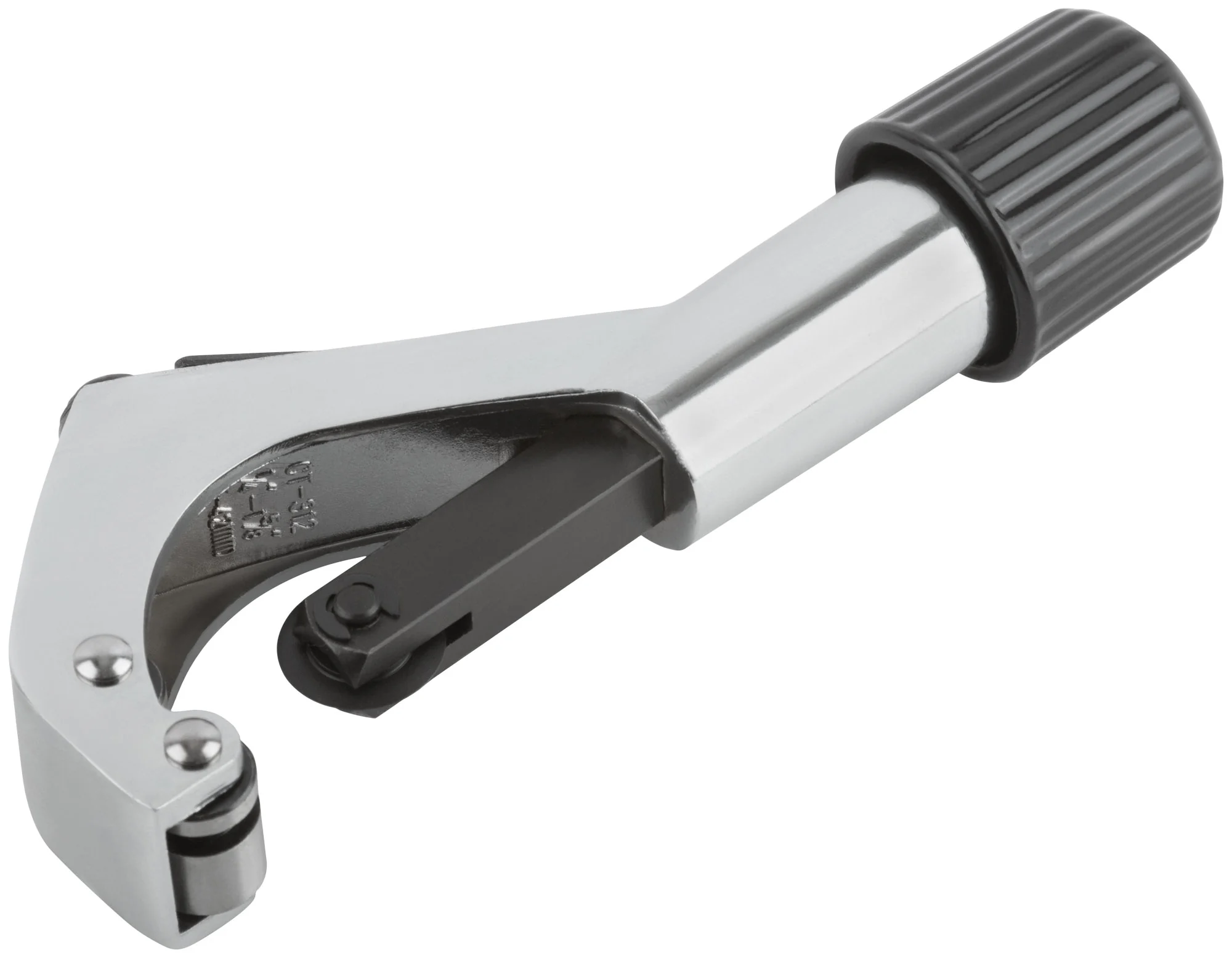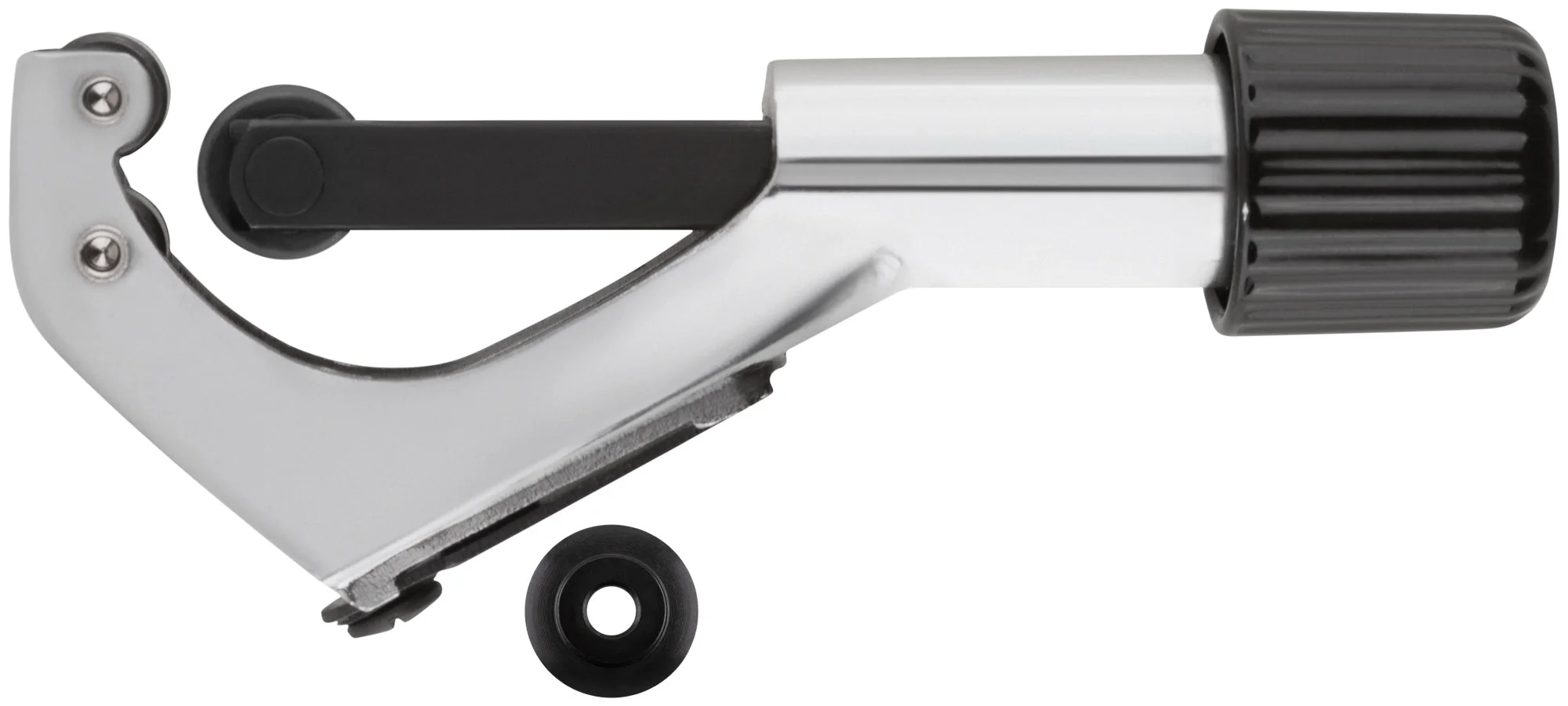 Конструкция трубореза включает корпус из алюминия с хромированным покрытием, что обеспечивает долговечность инструмента. Режущий ролик изготовлен из легированной стали для точной и эффективной резки. Опорные ролики, выдвижной риммер и держатель режущего ролика выполнены из инструментальной стали, что добавляет надежности в работе.