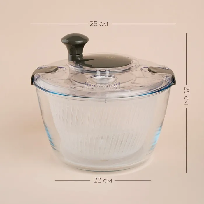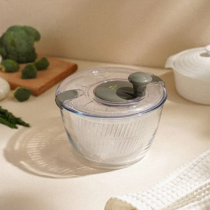 Основное преимущество этой центрифуги — использование жаропрочного стекла для чаши. Это не только придает ей долговечность, но и позволяет использовать её в качестве салатника. Прозрачная чаша облегчает контроль за процессом сушки, а стильный оливковый оттенок добавляет изысканности вашей кухне.
