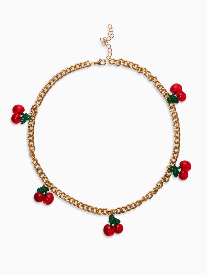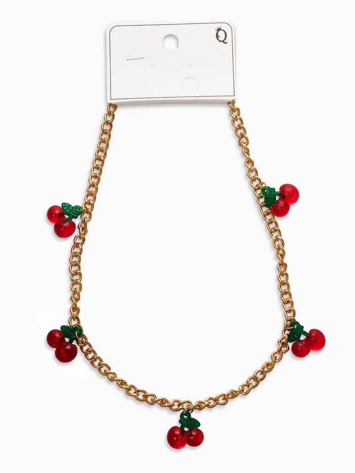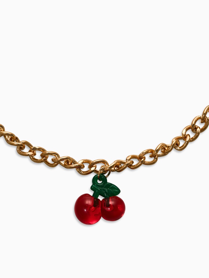Изюминка аксессуара заключается в яркой красной вишенке, создающей контраст с мягким сиянием золотых элементов. Цепочка выполнена из высококачественного металла, покрыта позолотой, придавая изделию изысканный блеск и долговечный вид.