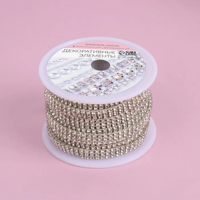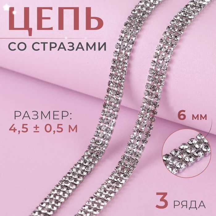 Цепь со стразами, 3 ряда, металл, стекло, 6 мм, 4.5±0.5 м, цвет серебряный — Характеристики