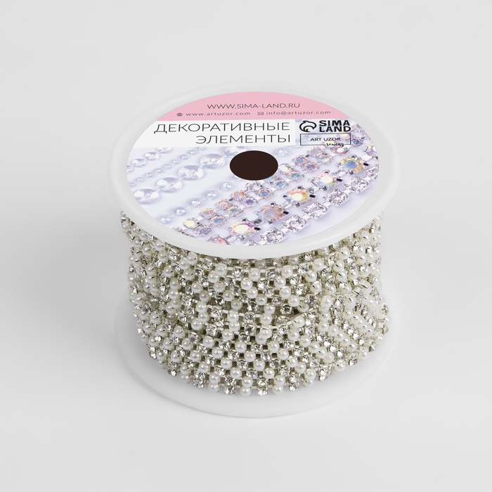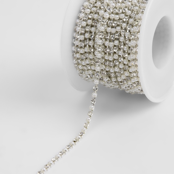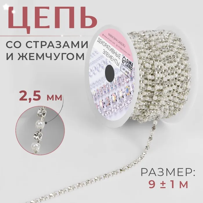 Цепь со стразами и жемчугом, металл, пластик, стекло, 2.5 мм, 9±1 м, цвет серебряный — Характеристики