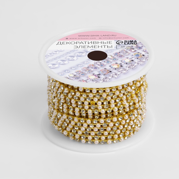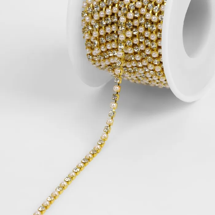 Цепь со стразами и жемчугом, металл, пластик, стекло, 2.5 мм, 9±1 м, цвет золотой — Характеристики