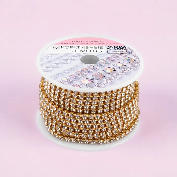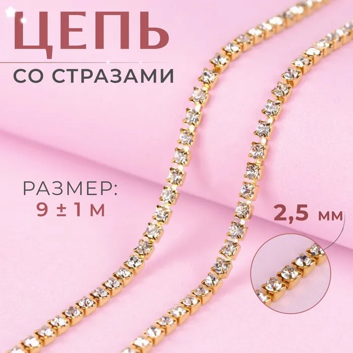 Цепь со стразами, металл, стекло, 2.5 мм, 9±1 м, цвет золотой — Характеристики