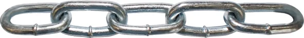 Цепь изготовлена из прочной стали и покрыта белым цинком, что обеспечивает защиту от коррозии и долговечность использования. Звенья овальной формы соединены между собой, что позволяет цепи выдерживать большие нагрузки по сравнению с другими стандартами.