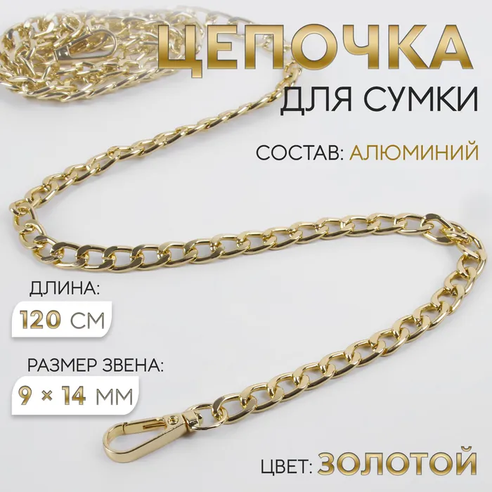 Цепочка для сумки, плоская, с карабинами, алюминиевая, 9×14 мм, 120 см, цвет золотой — Характеристики