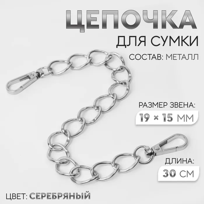 Цепочка для сумки, с карабинами, металлическая, плоская, 19×15 мм, 30 см, цвет серебряный — Характеристики