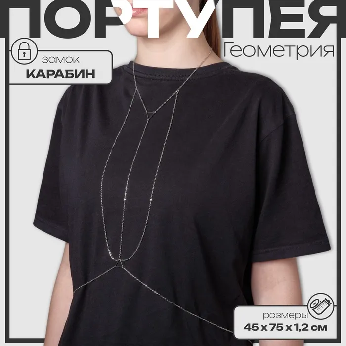 Портупея "Геометрия" - стильный и универсальный аксессуар, который подчеркнет вашу индивидуальность и добавит изюминку любому образу. Эту портупею можно носить как под одеждой, так и поверх нее – она прекрасно смотрится с платьем, футболкой или рубашкой. Удобная застежка-карабин обеспечивает комфортное ношение, а универсальный размер позволяет адаптировать портупею к разным типам фигуры. Выполнена из бижутерного сплава, легкая и удобная. Незаменимый аксессуар для тех, кто хочет быть в центре внимания не только на пляже или вечеринке, но и в повседневной жизни. Прекрасный подарок для девушки, подруги или близкого человека.