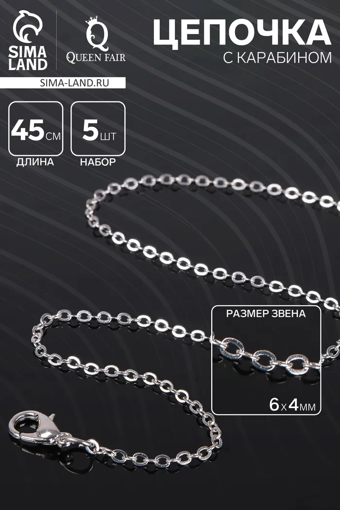 Цепочка с карабином, набор 5 шт. L=45 см, мелкое плетение, цвет серебро — Характеристики