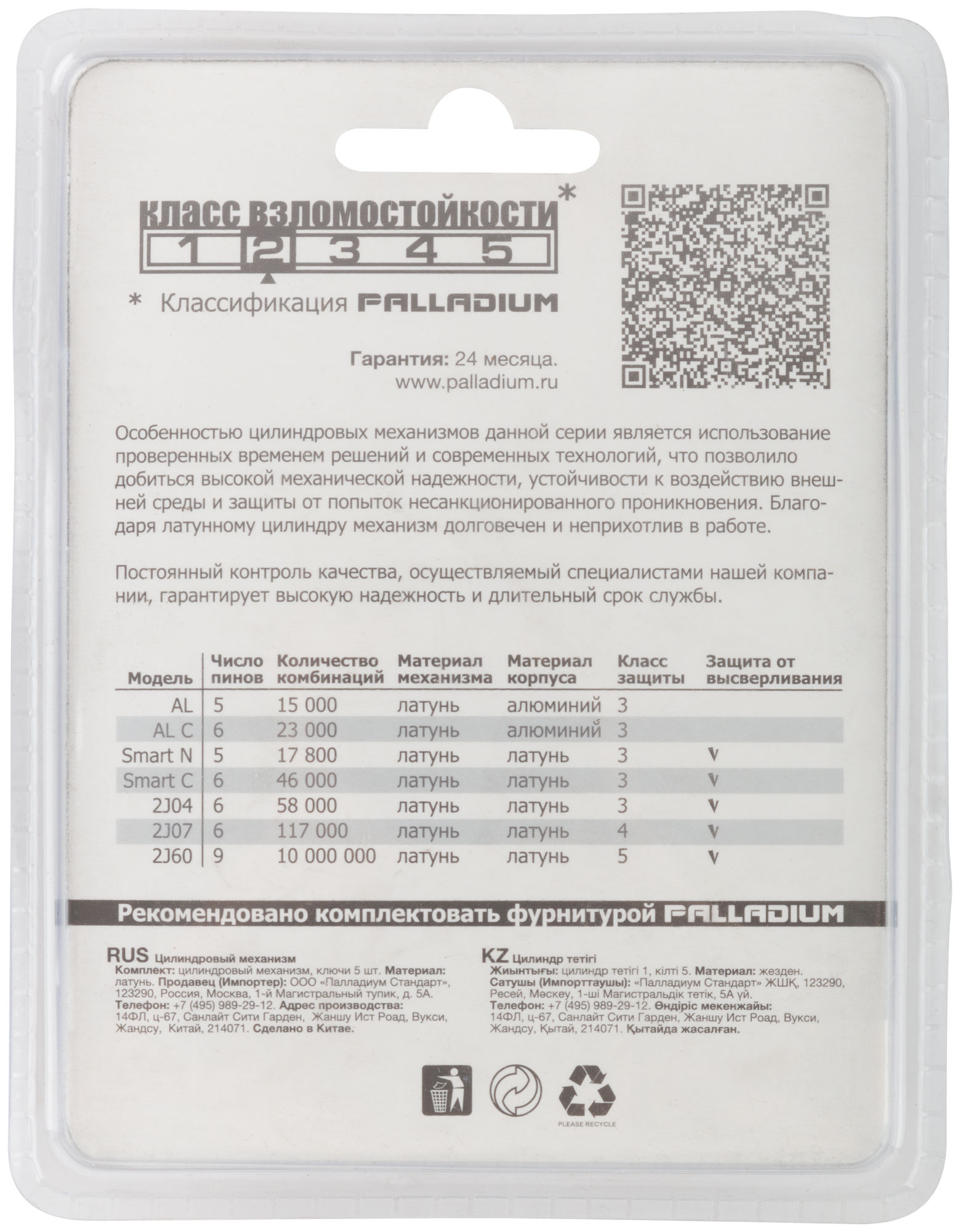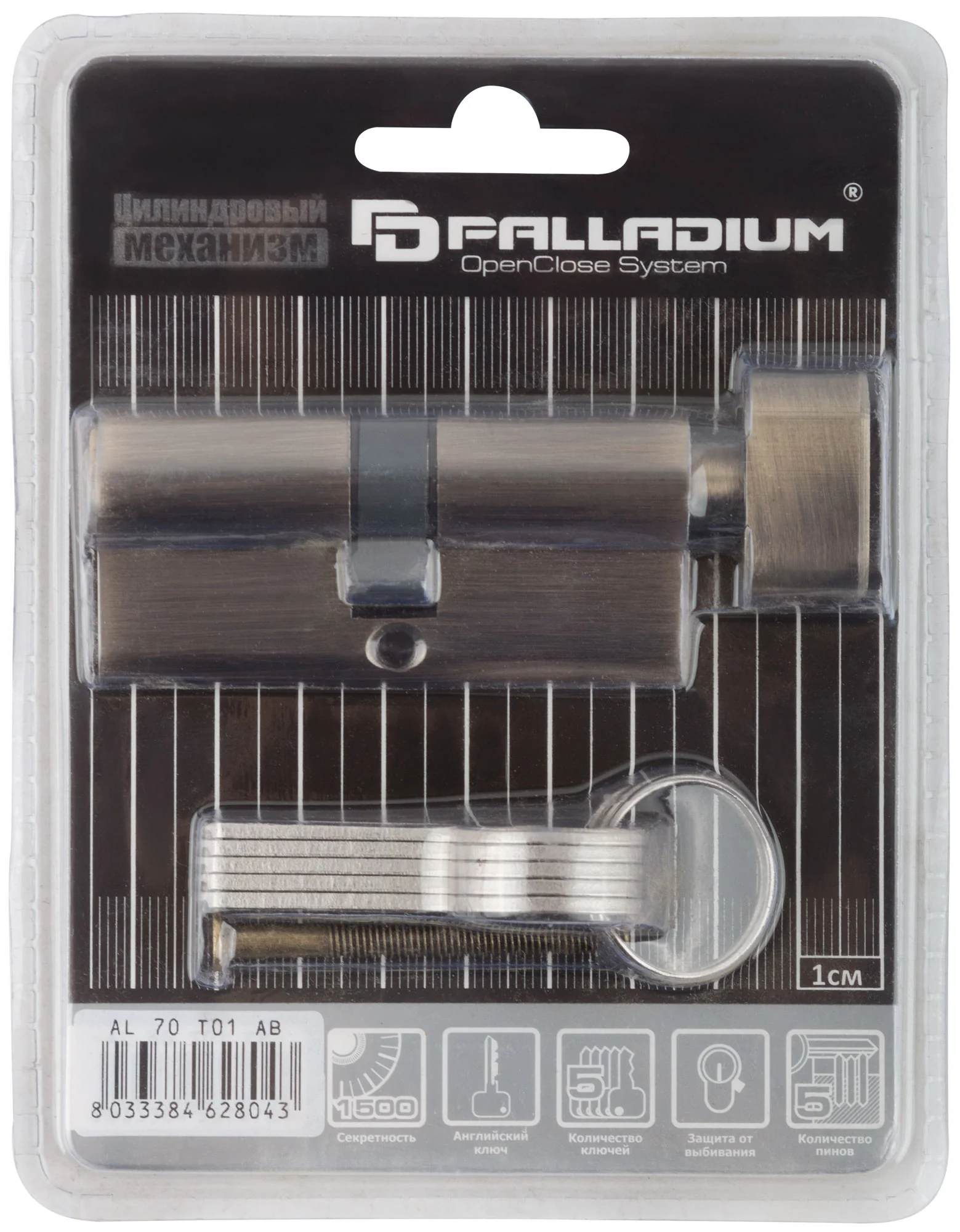 Механизм включает в себя цилиндр из латуни, который защищен штифтом из закаленной стали от высверливания, что повышает уровень безопасности. Комплект поставляется в блистере, что обеспечивает легкость хранения и транспортировки.