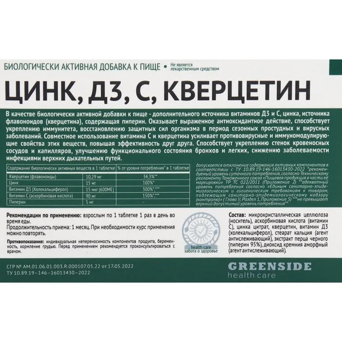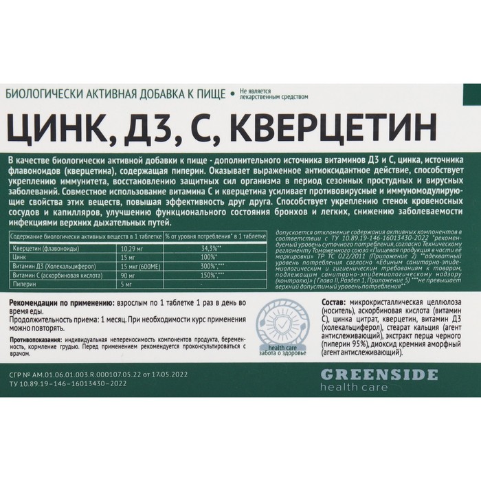 БАД Цинк, Д3, С, кверцетин: