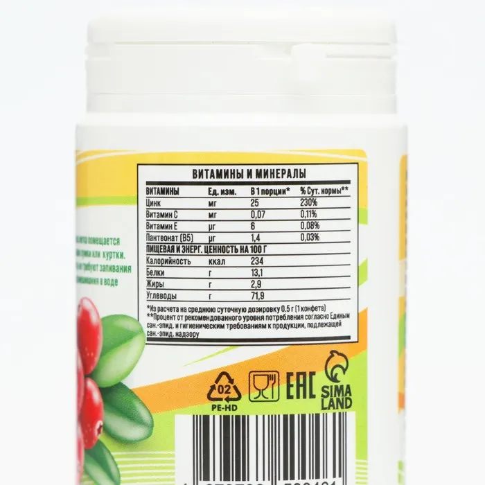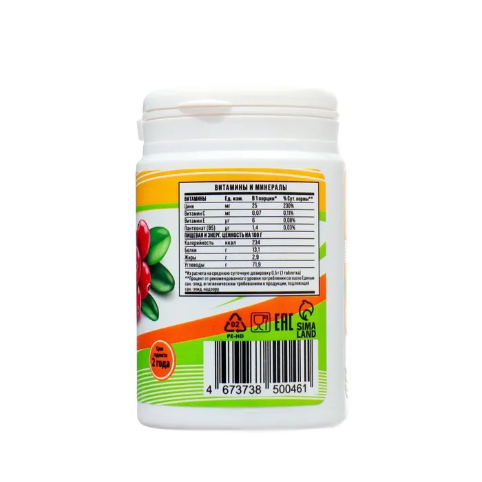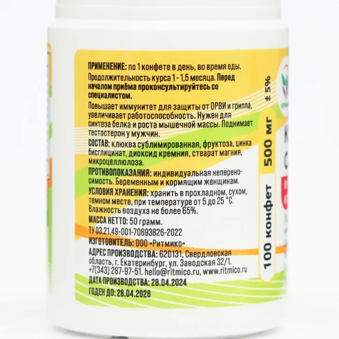 Состав: клюква сублимированная, фруктоза, цинка бисглицинат, диоксид кремния, стеарат магния, микроцеллюлоза.
