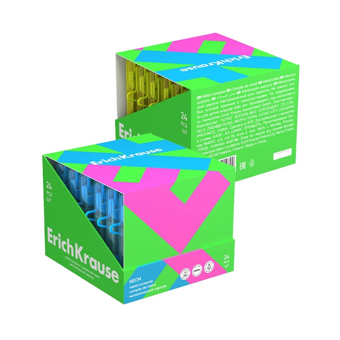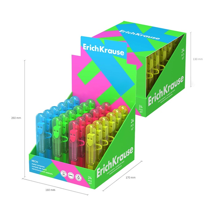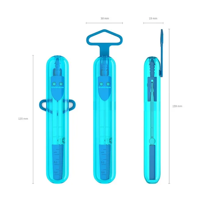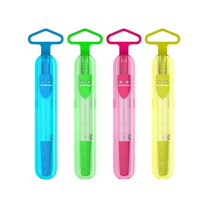 Металлический циркуль с максимальным радиусом 18см. Пластиковый чехол с линейкой обеспечивает защиту иглы и пишущего узла. Представлен в ярких неоновых цветах. Упакован в удобный пластиковый футляр с европодвесом.
