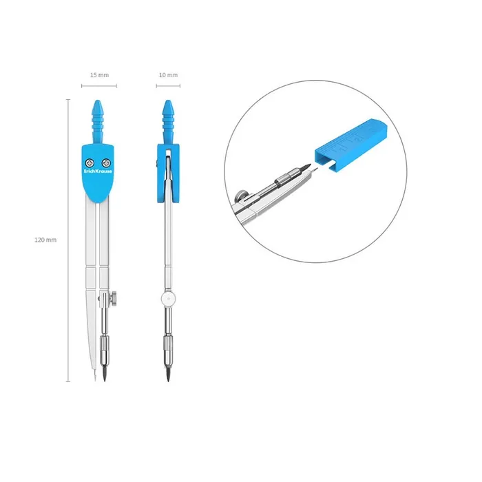Циркуль металлический Erich Krause S-Cool, 120 мм, максимальный радиус 18 см, пластиковый чехол с линейкой, европодвес, МИКС — Характеристики