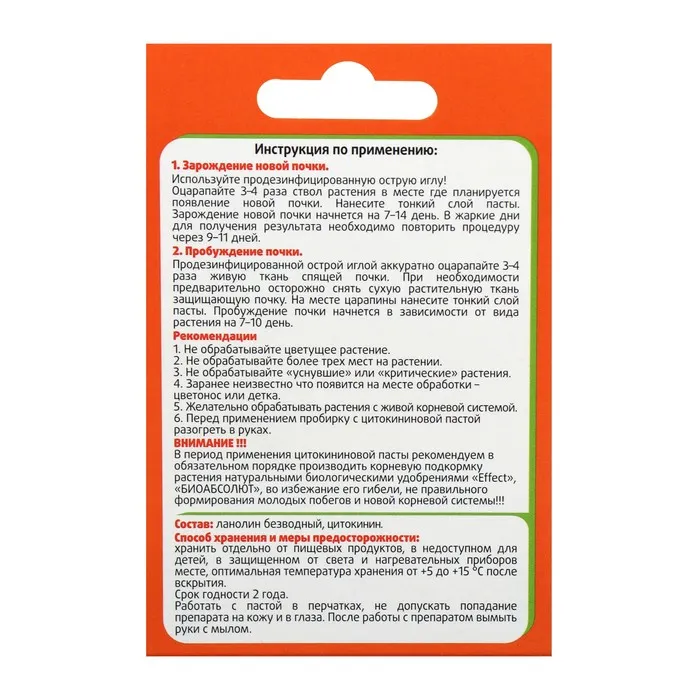 Паста цитокининовая стимулирует пробуждение спящих почек и образование новых с последующим прорастанием цветоноса и деток на 7—14-й день. Рекомендована для всех видов и сортов орхидей. В комнатной культуре они часто не просыпаются после зимовки и застывают на фазе покоя жизненного цикла. Наиболее благоприятный период для использования — время пробуждения растения. Для орхидей это конец зимы — начало весны.