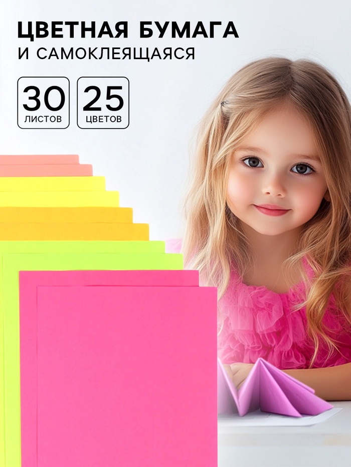 Цветная бумага А4, самоклеящаяся А5, набор 30 листов, 25 цветов, 80 г/м
