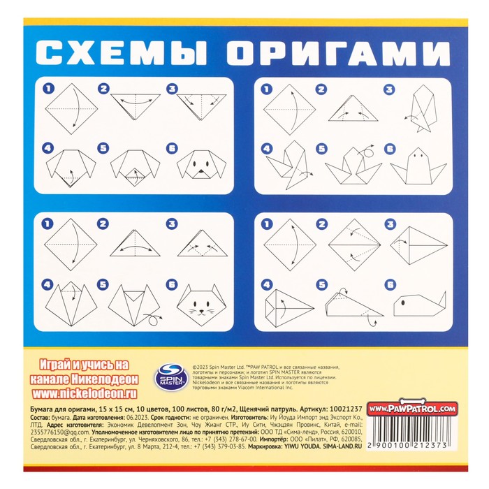 Цветная бумага для оригами, 15×15 см, 100 листов, 10 цветов, немелованная, двусторонняя, в пакете, 80 г/м², «Щенячий патруль» — Характеристики