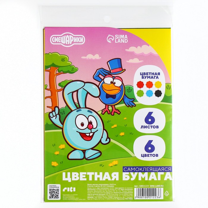 Цветная бумага самоклеящаяся, 14×19 см, 6 листов, 6 цветов, мелованная, односторонняя, в пакете, 80 г/м², «Смешарики» — Характеристики