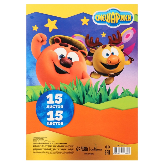 Цветной картон, А4, 15 листов, 15 цветов, мелованный, односторонний, в папке, 220 г/м², «Смешарики» — Характеристики